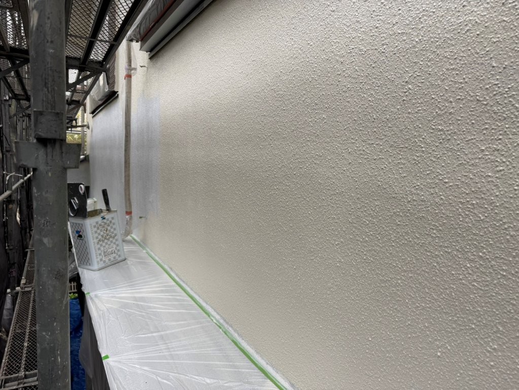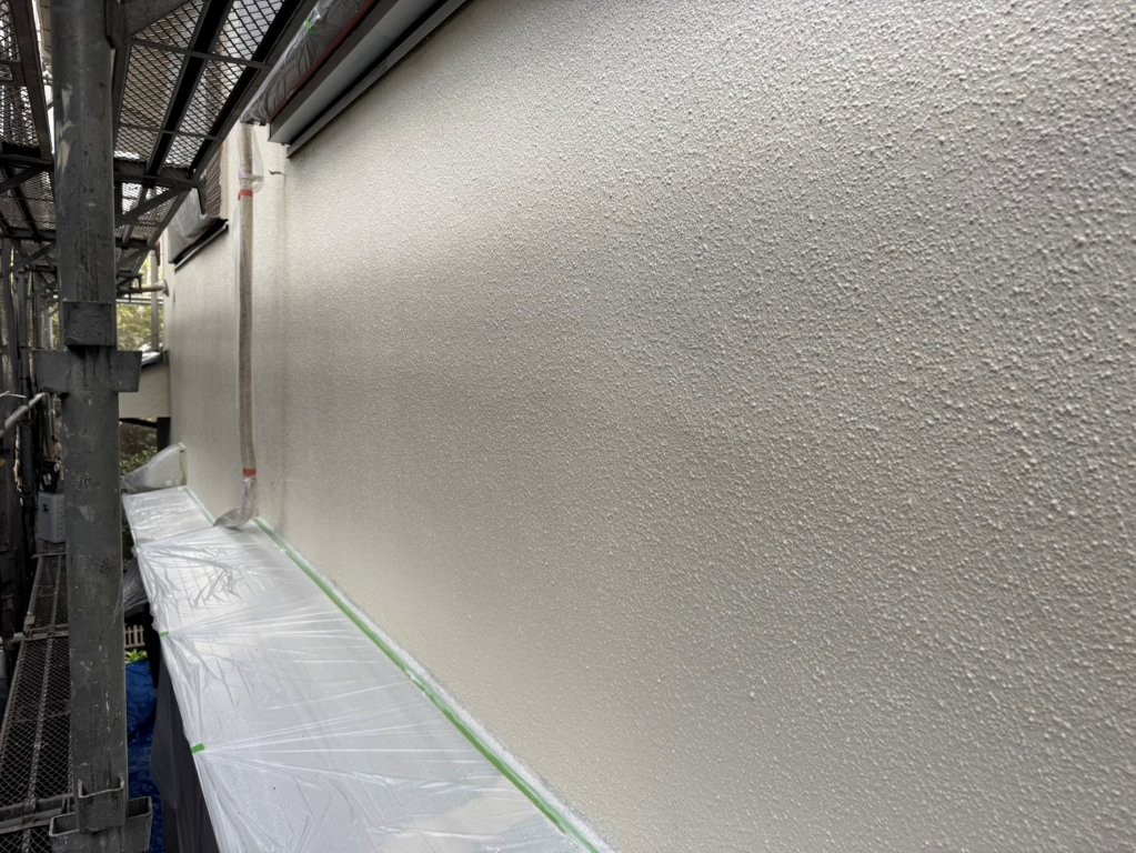 中塗り塗装完了後の外壁は、下塗り時よりもしっとりとした艶感があり、ムラのない均一な塗膜が形成されています。
