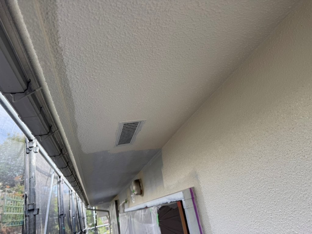 軒天部分も、照明器具や換気口まわりなど細部まで塗り残しがないよう慎重に施工。